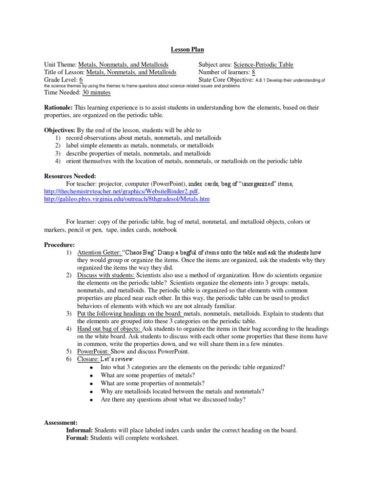 Lesson Plan Metals Nonmetals Metalloid Pdf Periodic Table Metals