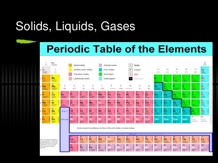 Periodic table showing solids liquids and gases. Asked in chemistry periodic table which elements are solid on the periodic table. Periodic table was first invented by dimitri mendeleev from russia. There are 110 elements in the new periodic table.