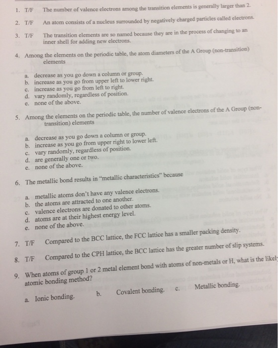 Solved 1 2 3 T F T F T F The Number Of Valence Electro