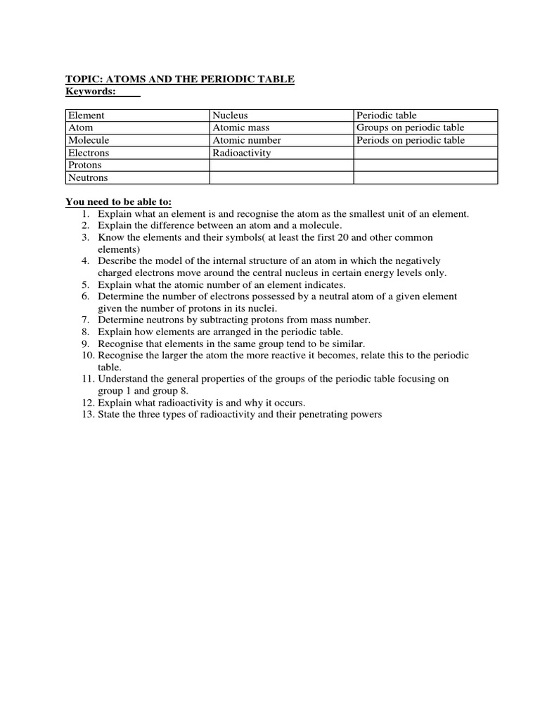 Unit Overview Key Words Atoms And The Periodic Table Words