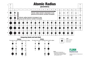 Image showing periodicity of the chemical elements for atomic radius empirical in a 3d spiral periodic table column style. Image showing periodicity of the chemical elements for atomic radius empirical in a spiral periodic table heatscape style. Atomic radii vary in a predictable and explicable manner across the periodic table.